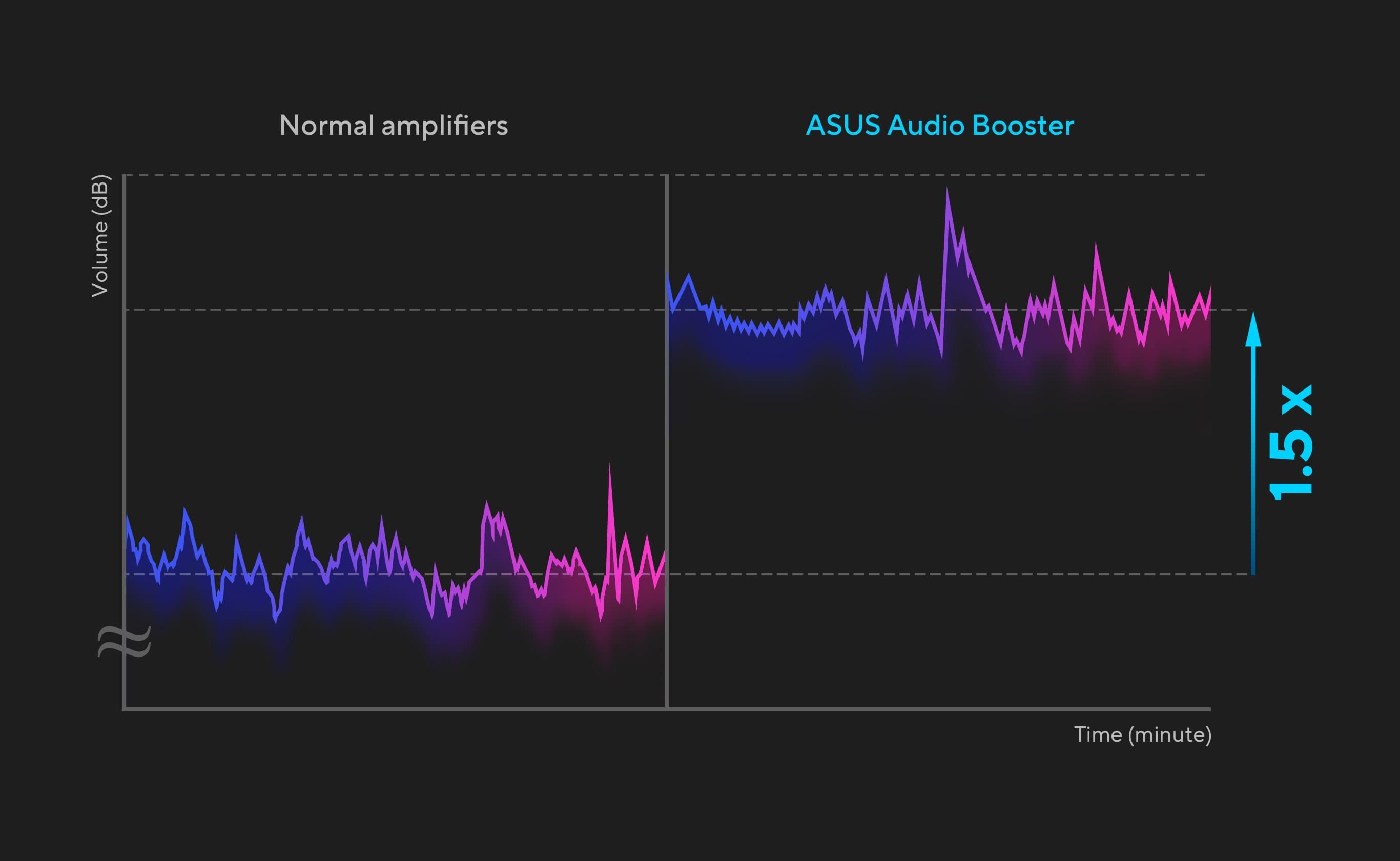 ASUS Audio Booster utilizează algoritmi audio unici pentru a crește volumul sunetului de până la 1,5 ori și pentru a duce calitatea sunetului la un nou nivel.