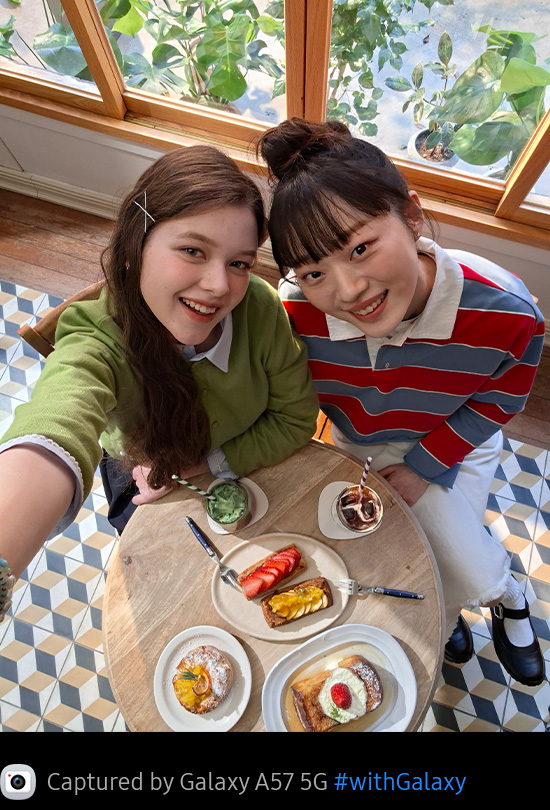 Благодаря функции Best Face на Galaxy A57 5G вы можете быстро и легко улучшить групповые фото. Просто выберите групповое анимированное фото, затем выделите самые удачные выражения и лица из нескольких снимков, объединив их в одно потрясающее фото, где все улыбаются.