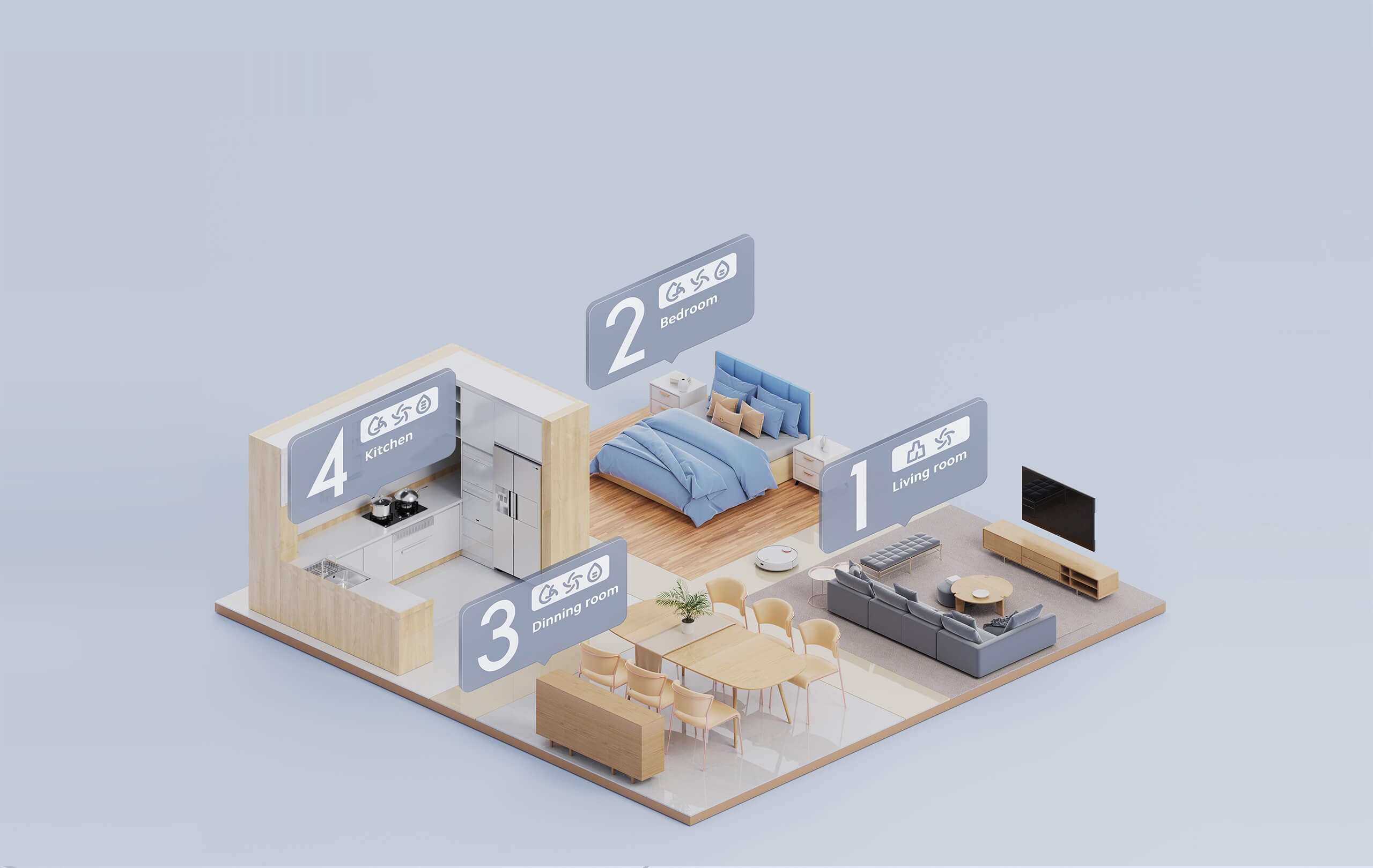 Теперь вы можете выбирать порядок уборки вашей спальни, гостиной и кухни в соответствии с вашими потребностями, чтобы не заносить грязь из одной комнаты в другую. Вы также можете отрегулировать мощность всасывания и объем воды в зависимости от типа пола и настроить индивидуальные планы уборки.