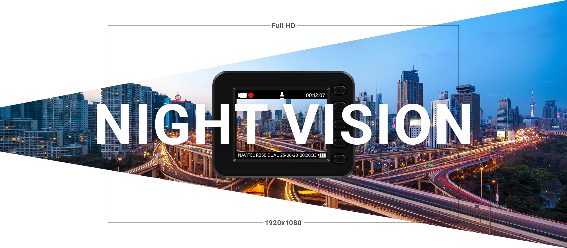 NAVITEL R250 DUAL оснащён сенсором GC2053 (ночное видение), стеклянной оптикой и имеет широкий угол обзора 140°, что обеспечивает высокое качество записи всего происходящего на дороге.